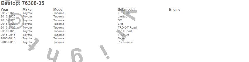 Below is an abbreviated list of applications for the Supertop Truck Bed Top.Tacoma, Toyota, 2020, 2019, 2018, 2017, 2016, 2015, 2014, 2013, 2012, 2011, 2010, 2009, 2008, 2007, 2006, 2005