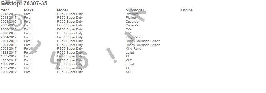 Below is an abbreviated list of applications for the Supertop Truck Bed Top.F-250 Super Duty, F-350 Super Duty, Ford, 2017, 2016, 2015, 2014, 2013, 2012, 2011, 2010, 2009, 2008, 2007, 2006, 2005, 2004, 2003, 2002, 2001
