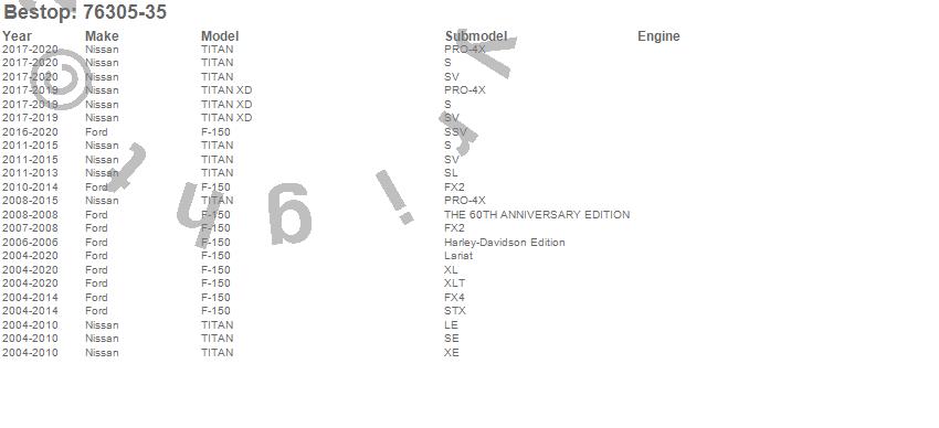 Below is an abbreviated list of applications for the Supertop Truck Bed Top.F-150, TITAN, TITAN XD, Ford, Nissan, 2020, 2019, 2018, 2017, 2016, 2015, 2014, 2013, 2012, 2011, 2010, 2009, 2008, 2007, 2006