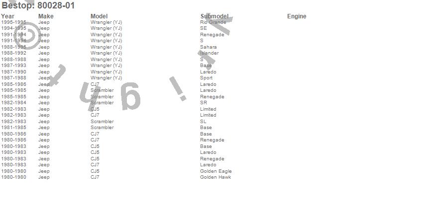 Below is an abbreviated list of applications for the Windjammer Wind Screen.CJ5, CJ7, Scrambler, Wrangler (YJ), Jeep, 1995, 1994, 1993, 1992, 1991, 1990, 1989, 1988, 1987, 1986, 1985, 1984, 1983, 1982, 1981