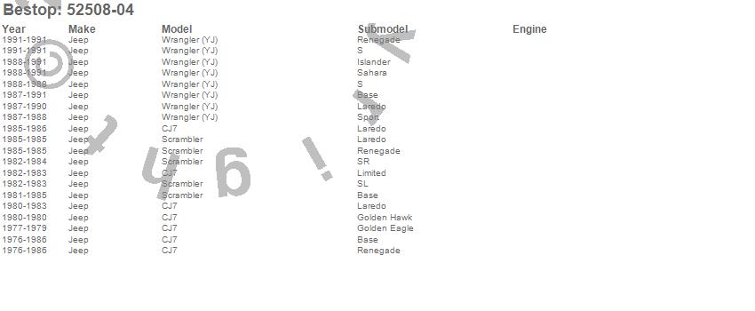 Below is an abbreviated list of applications for the Traditional Bikini Top.CJ7, Scrambler, Wrangler (YJ), Jeep, 1991, 1990, 1989, 1988, 1987, 1986, 1985, 1984, 1983, 1982, 1981, 1980, 1979, 1978, 1977, 1976