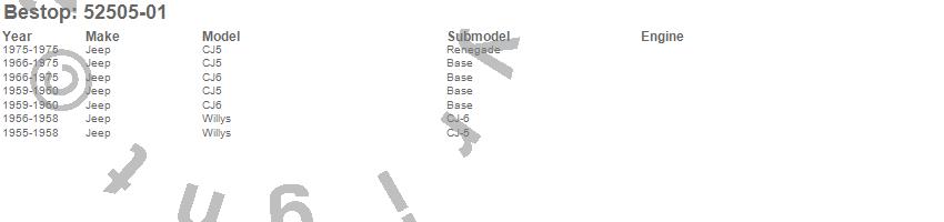 Below is an abbreviated list of applications for the Traditional Bikini Top.CJ5, CJ6, Willys, Jeep, 1975, 1974, 1973, 1972, 1971, 1970, 1969, 1968, 1967, 1966, 1960, 1959, 1958, 1957, 1956, 1955