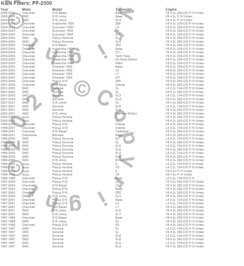 Below is an abbreviated list of applications for the In-Line Gas Filter.Avalanche 1500, Bravada, Hombre, S10 Blazer, S10 Pickup, S15 Jimmy, Silverado 1500, Sonoma, Suburban 1500, Chevrolet, GMC, Isuzu, Oldsmobile, 2005, 2004, 2003, 2002, 2001, 2000, 1999