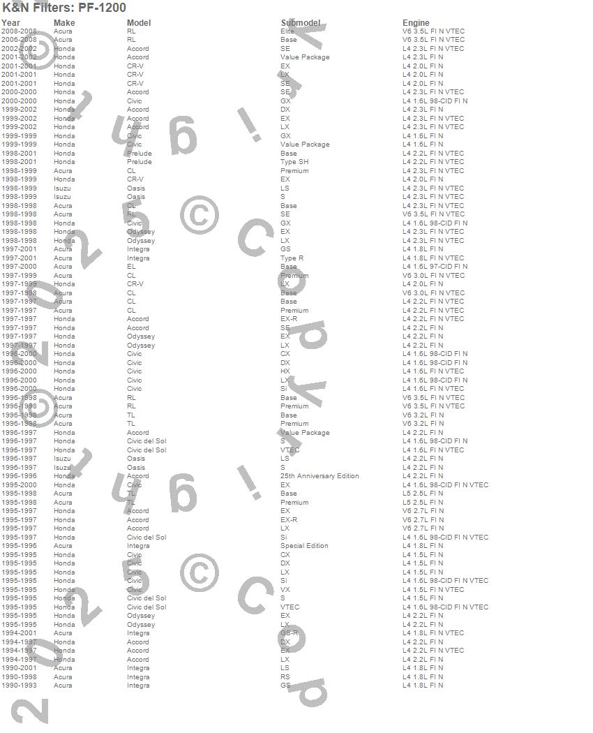 Below is an abbreviated list of applications for the In-Line Gas Filter.Accord, Civic, Civic del Sol, CL, CR-V, EL, Integra, Oasis, Odyssey, Prelude, RL, TL, Acura, Honda, Isuzu, 2008, 2007, 2006, 2002, 2001
