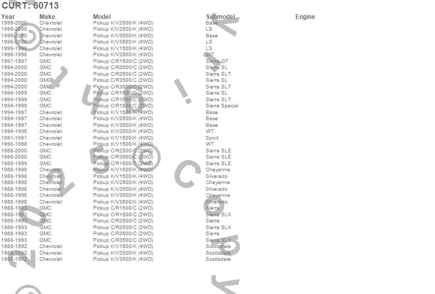 Below is an abbreviated list of applications for the Double-Lock Gooseneck Hitch/Install Kit.C1500 Pickup, C2500 Pickup, C3500 Pickup, K1500 Pickup, K2500 Pickup, K3500 Pickup, Chevrolet, GMC, 2000, 1999, 1998, 1997, 1996, 1995, 1994, 1993, 1992, 1991, 1990, 1989