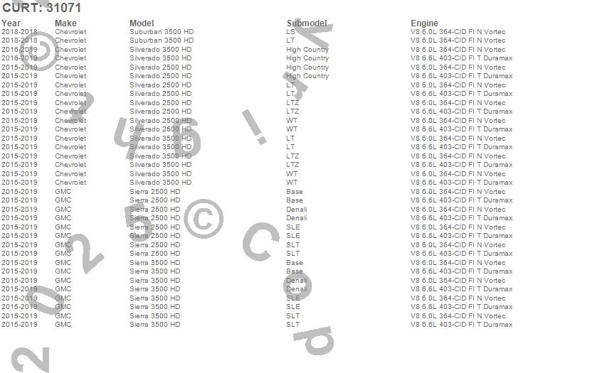 Below is an abbreviated list of applications for the 2 in. Receiver Hitch.Sierra 2500 HD, Sierra 3500 HD, Silverado 2500 HD, Silverado 3500 HD, Suburban 3500 HD, Chevrolet, GMC, 2019, 2018, 2017, 2016, 2015