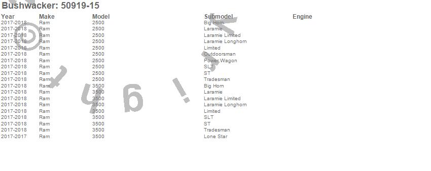 Brand: BushwackerPart Number: 50919-15Fender Flare Type: 4 pc. - Front Coverage 2.6 in. - Front Height 4.75 in. - Rear Coverage 2 in - Rear Height 4.75 in. - Bright White Clear CoatUPC: 090689118929