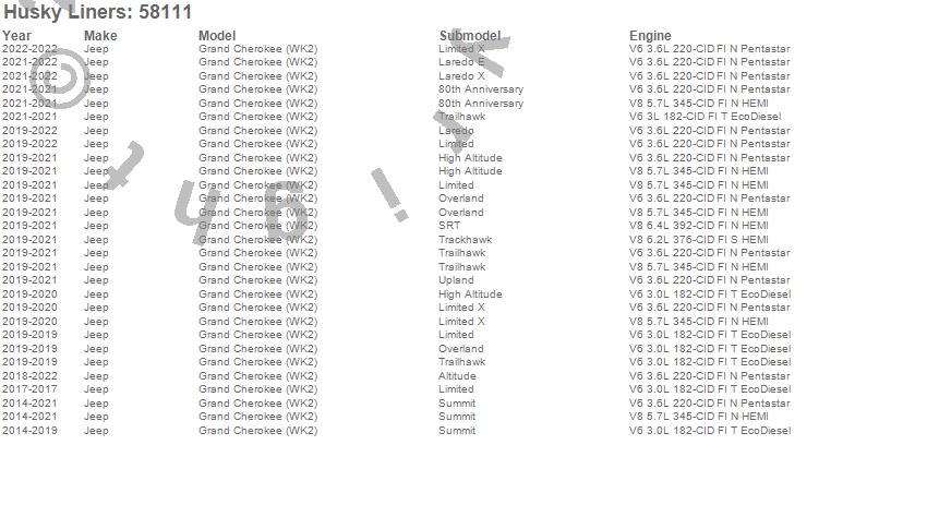 Below is an abbreviated list of applications for the Custom Molded Mud Guards.Grand Cherokee (WK2), Jeep, 2022, 2021, 2020, 2019, 2018, 2017, 2016, 2015, 2014