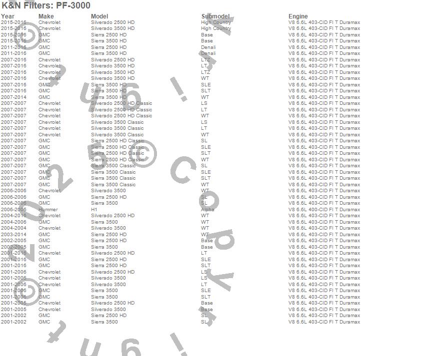 Below is an abbreviated list of applications for the In-Line Gas Filter.H1, Sierra 2500 HD, Sierra 2500 HD Classic, Sierra 3500, Sierra 3500 Classic, Sierra 3500 HD, Silverado 2500 HD, Silverado 2500 HD Classic, Silverado 3500, Silverado 3500 Classic, Silverado 3500 HD, Chevrolet, GMC, Hummer, 2015, 2014, 2013, 2012, 2011, 2010