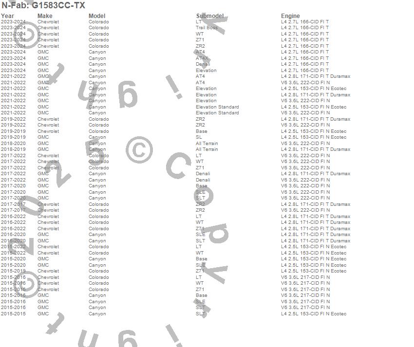 Below is an abbreviated list of applications for the Wheel To Wheel Nerf Step Bar.Canyon, Colorado, Chevrolet, GMC, 2025, 2024, 2023, 2022, 2021, 2020, 2019, 2018, 2017, 2016, 2015