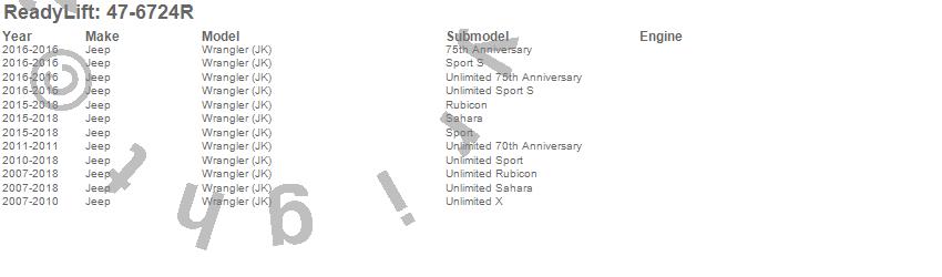 Below is an abbreviated list of applications for the Spring Kit.Wrangler (JK), Jeep, 2018, 2017, 2016, 2015, 2014, 2013, 2012, 2011, 2010, 2009, 2008, 2007