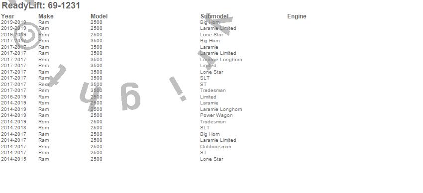 Below is an abbreviated list of applications for the SST Lift Kit w/Shocks.2500, 3500, Ram, 2019, 2018, 2017, 2016, 2015, 2014