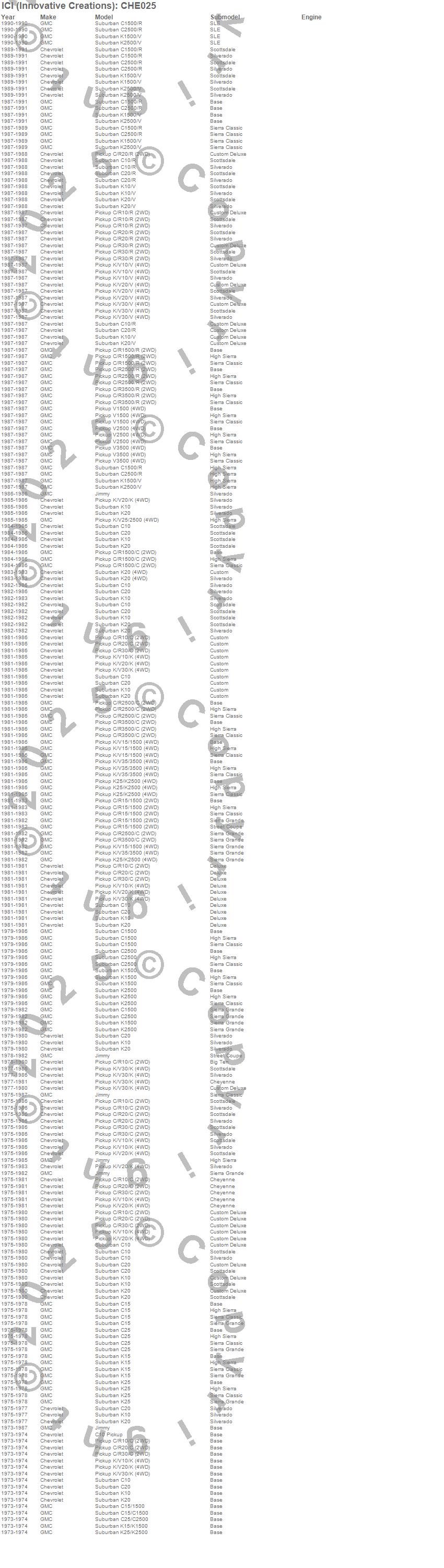 Below is an abbreviated list of applications for the Stainless Steel Fender Trim.C10 Pickup, C10 Suburban, C15 Suburban, C15/C1500 Suburban, C1500 Pickup, C1500 Suburban, C20 Pickup, C20 Suburban, C25 Suburban, C25/C2500 Suburban, C2500 Pickup, C2500 Suburban, C30 Pickup, C3500 Pickup, Jimmy, K10 Pickup, K10 Suburban, K15 Suburban, K15/K1500 Suburban, K1500 Pickup