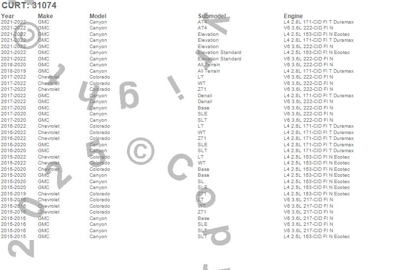 Below is an abbreviated list of applications for the 2 in. Receiver Hitch.Canyon, Colorado, Chevrolet, GMC, 2022, 2021, 2020, 2019, 2018, 2017, 2016, 2015