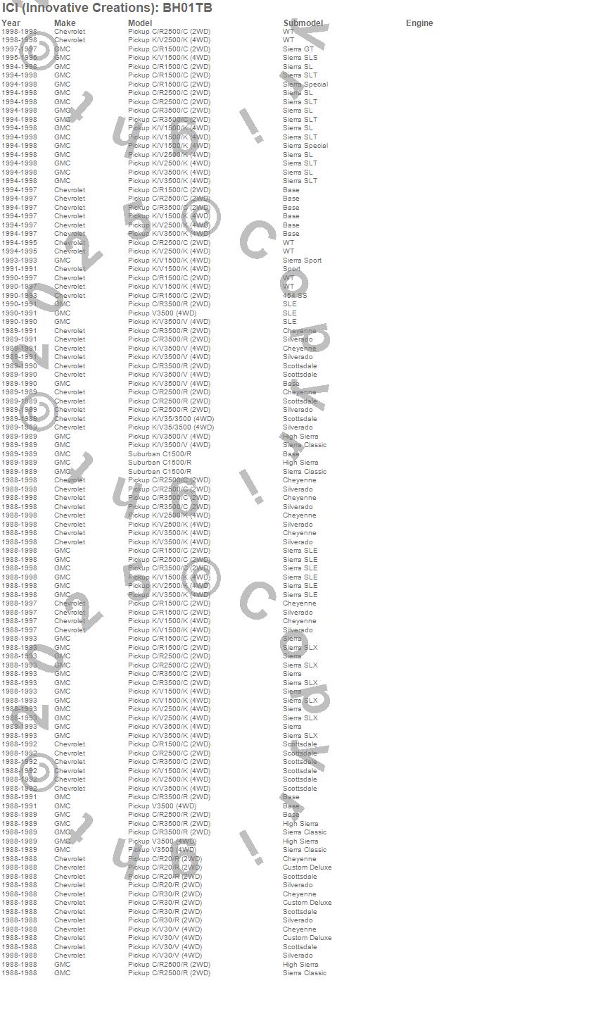 Below is an abbreviated list of applications for the Truck Bed Bulkhead Cap.C1500 Pickup, C2500 Pickup, C3500 Pickup, K1500, K1500 Pickup, K2500 Pickup, K3500 Pickup, R20 Pickup, R2500 Pickup, R30 Pickup, R3500 Pickup, V30 Pickup, V3500 Pickup, Chevrolet, GMC, 1998, 1997, 1996, 1995, 1994