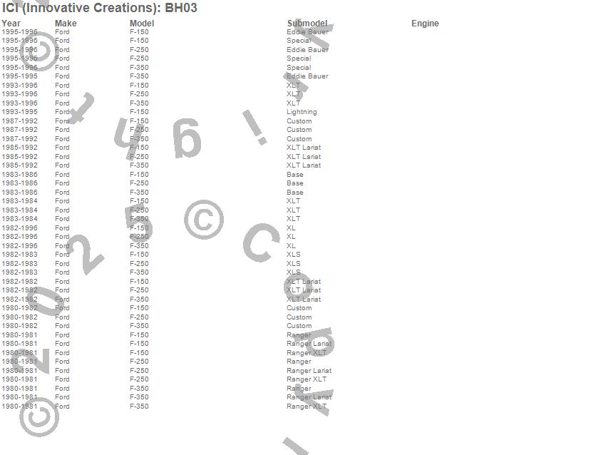 Below is an abbreviated list of applications for the Truck Bed Bulkhead Cap.F-150, F-250, F-350, Ford, 1996, 1995, 1994, 1993, 1992, 1991, 1990, 1989, 1988, 1987, 1986, 1985, 1984, 1983, 1982, 1981