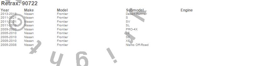 Below is an abbreviated list of applications for the PowertraxPRO MX Retractable Tonneau Cover.Frontier, Nissan, 2021, 2020, 2019, 2018, 2017, 2016, 2015, 2014, 2013, 2012, 2011, 2010, 2009, 2008, 2007, 2006, 2005