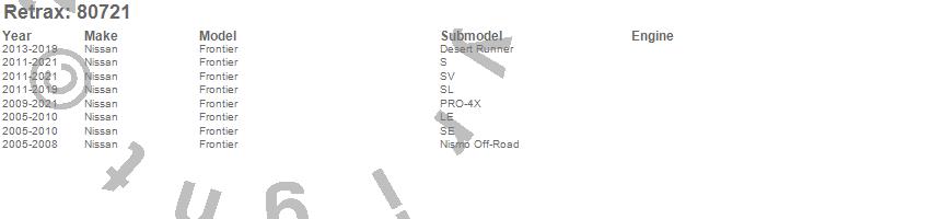 Below is an abbreviated list of applications for the RetraxPRO MX Retractable Tonneau Cover.Frontier, Nissan, 2021, 2020, 2019, 2018, 2017, 2016, 2015, 2014, 2013, 2012, 2011, 2010, 2009, 2008, 2007, 2006, 2005