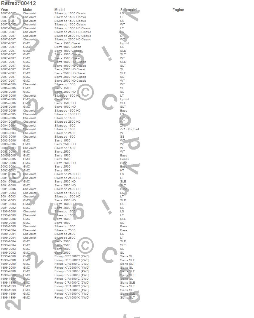 Below is an abbreviated list of applications for the RetraxPRO MX Retractable Tonneau Cover.C1500 Pickup, C3500 Pickup, K1500 Pickup, K2500 Pickup, Sierra 1500, Sierra 1500 Classic, Sierra 1500 HD, Sierra 1500 HD Classic, Sierra 2500, Sierra 2500 HD, Sierra 2500 HD Classic, Silverado 1500, Silverado 1500 Classic, Silverado 1500 HD, Silverado 1500 HD Classic, Silverado 2500, Silverado 2500 HD, Silverado 2500 HD Classic, Chevrolet, GMC