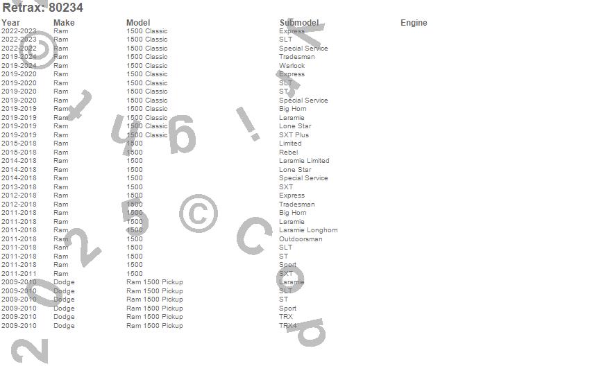Below is an abbreviated list of applications for the RetraxPRO MX Retractable Tonneau Cover.1500, 1500 Classic, Ram 1500, Dodge, Ram, 2024, 2023, 2022, 2021, 2020, 2019, 2018, 2017, 2016, 2015, 2014, 2013, 2012, 2011, 2010