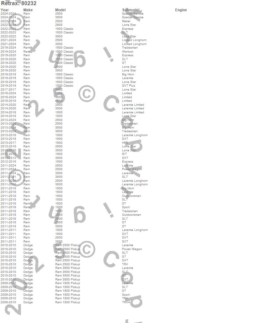 Below is an abbreviated list of applications for the RetraxPRO MX Retractable Tonneau Cover.1500, 1500 Classic, 2500, 3500, Ram 1500, Ram 2500, Ram 3500, Dodge, Ram, 2024, 2023, 2022, 2021, 2020, 2019, 2018, 2017, 2016, 2015, 2014