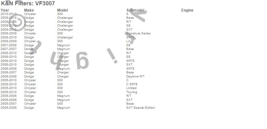 Below is an abbreviated list of applications for the Cabin Air Filter.300, Challenger, Charger, Magnum, Chrysler, Dodge, 2010, 2009, 2008, 2007, 2006, 2005