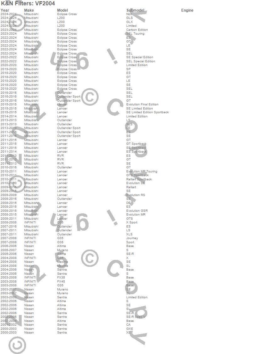 Below is an abbreviated list of applications for the Cabin Air Filter.Altima, Eclipse Cross, FX35, FX45, G35, Lancer, Maxima, Murano, Outlander, Outlander Sport, RVR, Sentra, Infiniti, Mitsubishi, Nissan, 2018, 2016, 2015, 2014, 2013