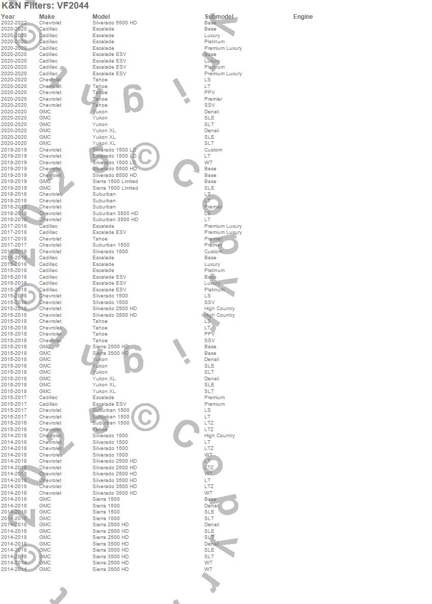 Below is an abbreviated list of applications for the Cabin Air Filter.Escalade, Escalade ESV, Sierra 1500, Sierra 2500 HD, Sierra 3500 HD, Silverado 1500, Silverado 2500 HD, Silverado 3500 HD, Suburban, Suburban 1500, Suburban 3500 HD, Tahoe, Yukon, Yukon XL, Cadillac, Chevrolet, GMC, 2018, 2017, 2016