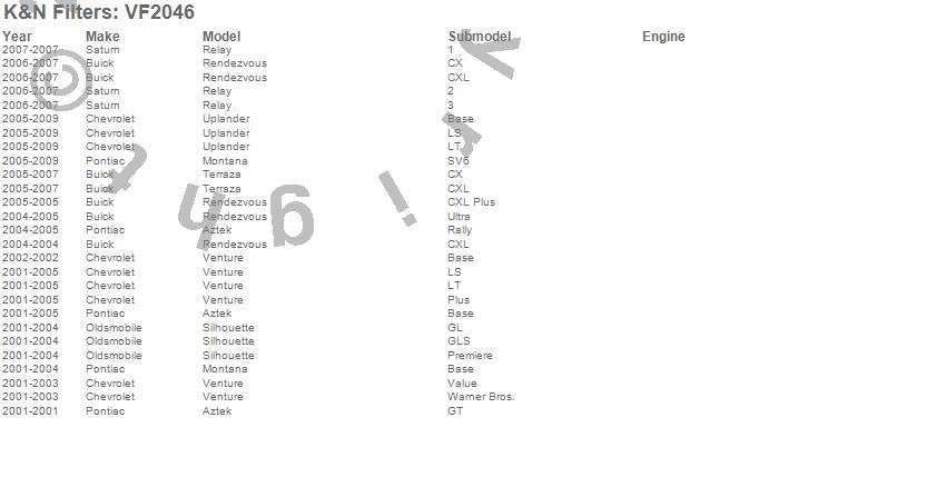 Below is an abbreviated list of applications for the Cabin Air Filter.Aztek, Montana, Relay, Rendezvous, Silhouette, Terraza, Uplander, Venture, Buick, Chevrolet, Oldsmobile, Pontiac, Saturn, 2009, 2008, 2007, 2006, 2005, 2004, 2003