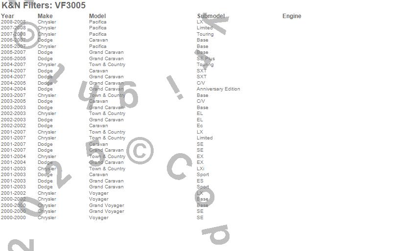 Below is an abbreviated list of applications for the Cabin Air Filter.Caravan, Grand Caravan, Grand Voyager, Pacifica, Town & Country, Voyager, Chrysler, Dodge, 2008, 2007, 2006, 2005, 2004, 2003, 2002, 2001, 2000