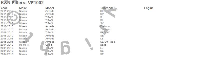Below is an abbreviated list of applications for the Cabin Air Filter.Armada, QX56, Titan, Infiniti, Nissan, 2015, 2014, 2013, 2012, 2011, 2010, 2009, 2008, 2007, 2006, 2005, 2004