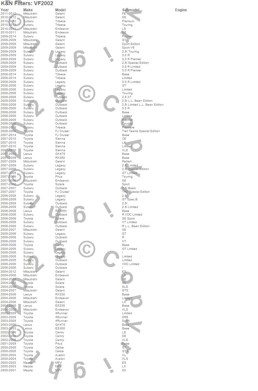 Below is an abbreviated list of applications for the Cabin Air Filter.4Runner, Avalon, Camry, Celica, Endeavor, ES300, ES330, FJ Cruiser, Galant, GX470, Legacy, MPV, Outback, Prius, RX330, RX350, RX400h, Sienna, Solara, Tribeca