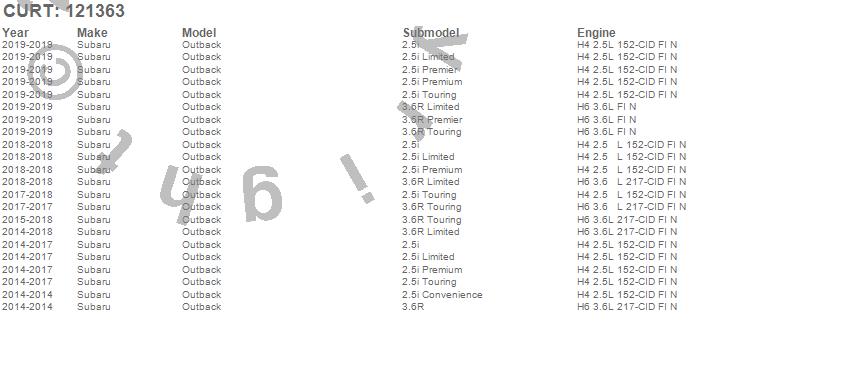 Below is an abbreviated list of applications for the Class II 1.25 in. Receiver Hitch.Outback, Subaru, 2019, 2018, 2017, 2016, 2015, 2014