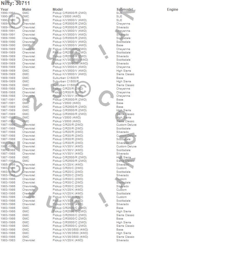 Below is an abbreviated list of applications for the Pro-Line Replacement Carpet.C20 Pickup, C2500 Pickup, C30 Pickup, C3500 Pickup, K20 Pickup, K30 Pickup, K3500 Pickup, R20 Pickup, R2500 Pickup, R30 Pickup, R3500 Pickup, V30 Pickup, V3500 Pickup, Chevrolet, GMC, 1991, 1990, 1989, 1988, 1987