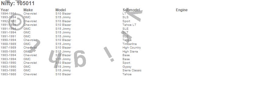 Below is an abbreviated list of applications for the Pro-Line Replacement Carpet.S10 Blazer, S15 Jimmy, Chevrolet, GMC, 1994, 1993, 1992, 1991, 1990, 1989, 1988, 1987, 1986, 1985, 1984, 1983