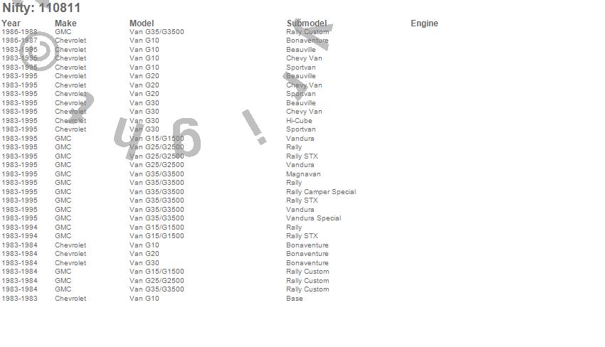 Below is an abbreviated list of applications for the Pro-Line Replacement Carpet.G10 Van, G15/G1500 Van, G20 Van, G25/G2500 Van, G30 Van, G35/G3500 Van, Chevrolet, GMC, 1996, 1995, 1994, 1993, 1992, 1991, 1990, 1989, 1988, 1987, 1986, 1985