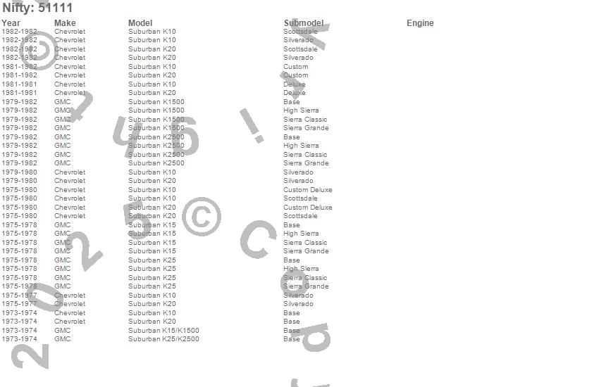 Below is an abbreviated list of applications for the Pro-Line Replacement Carpet.K10 Suburban, K15 Suburban, K15/K1500 Suburban, K1500 Suburban, K20 Suburban, K25 Suburban, K25/K2500 Suburban, K2500 Suburban, Chevrolet, GMC, 1982, 1981, 1980, 1979, 1978, 1977, 1976, 1975, 1974, 1973