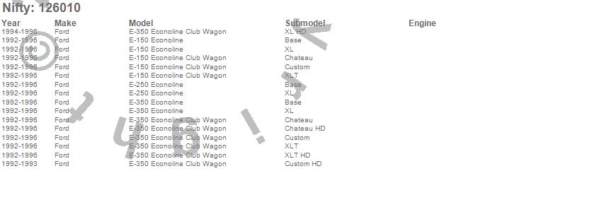 Below is an abbreviated list of applications for the Pro-Line Replacement Carpet.E-150 Econoline, E-150 Econoline Club Wagon, E-250 Econoline, E-350 Econoline, E-350 Econoline Club Wagon, Ford, 1996, 1995, 1994, 1993, 1992
