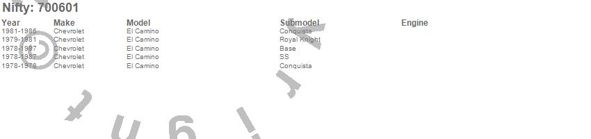 Below is an abbreviated list of applications for the Pro-Line Replacement Carpet.El Camino, Chevrolet, 1987, 1986, 1985, 1984, 1983, 1982, 1981, 1980, 1979, 1978