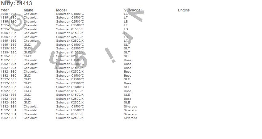 Below is an abbreviated list of applications for the Pro-Line Replacement Carpet.C1500 Suburban, C2500 Suburban, K1500 Suburban, K2500 Suburban, Chevrolet, GMC, 1995, 1994, 1993, 1992