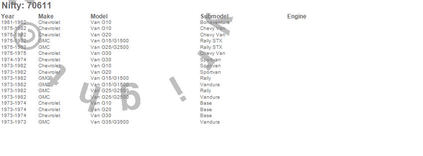 Below is an abbreviated list of applications for the Pro-Line Replacement Carpet.G10 Van, G15/G1500 Van, G20 Van, G25/G2500 Van, G30 Van, G35/G3500 Van, Chevrolet, GMC, 1982, 1981, 1980, 1979, 1978, 1977, 1976, 1975, 1974, 1973