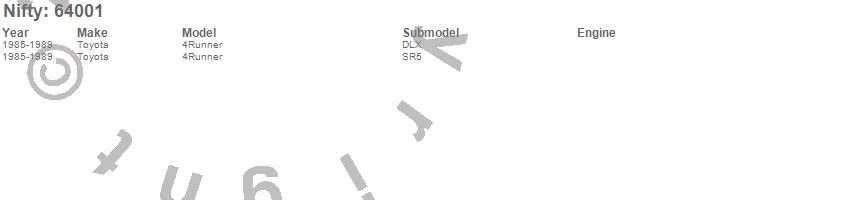 Below is an abbreviated list of applications for the Pro-Line Replacement Carpet.4Runner, Toyota, 1989, 1988, 1987, 1986, 1985