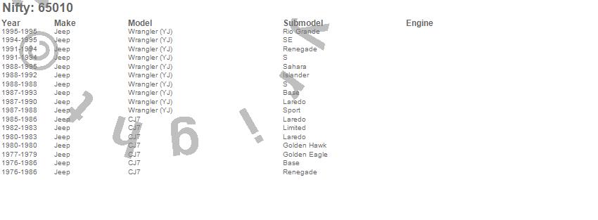 Below is an abbreviated list of applications for the Pro-Line Replacement Carpet.CJ7, Wrangler (YJ), Jeep, 1995, 1994, 1993, 1992, 1991, 1990, 1989, 1988, 1987, 1986, 1985, 1984, 1983, 1982, 1981, 1980, 1979