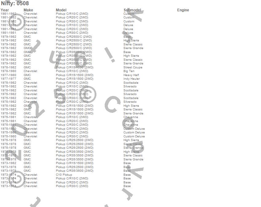 Below is an abbreviated list of applications for the Pro-Line Replacement Carpet.C10 Pickup, C1500 Pickup, C20 Pickup, C25/C2500 Pickup, C2500 Pickup, C30 Pickup, C35/C3500 Pickup, C3500 Pickup, Chevrolet, GMC, 1982, 1981, 1980, 1979, 1978, 1977, 1976, 1975, 1974, 1973