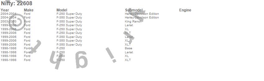 Below is an abbreviated list of applications for the Pro-Line Replacement Carpet.F-250, F-250 Super Duty, F-350 Super Duty, Ford, 2006, 2005, 2004, 2003, 2002, 2001, 2000, 1999, 1998