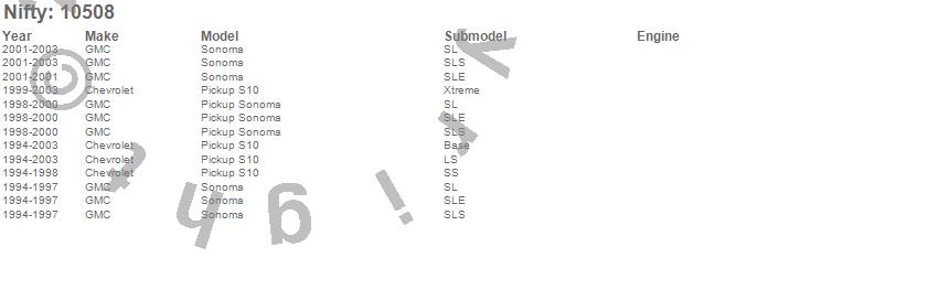 Below is an abbreviated list of applications for the Pro-Line Replacement Carpet.S10 Pickup, Sonoma, Chevrolet, GMC, 2003, 2002, 2001, 2000, 1999, 1998, 1997, 1996, 1995, 1994