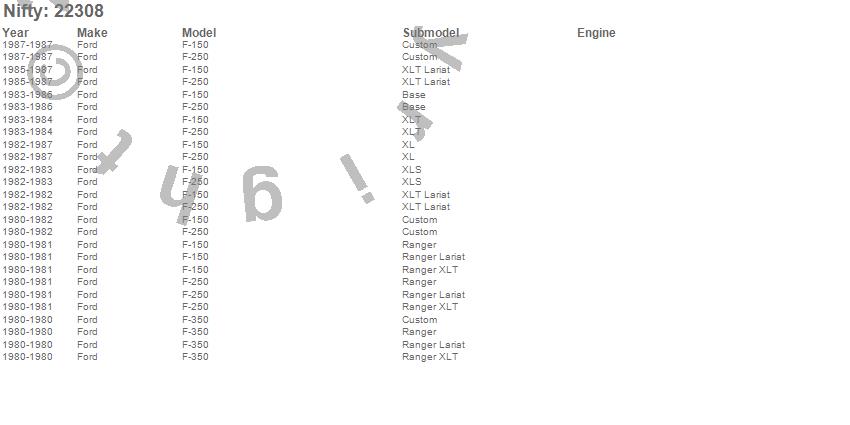 Below is an abbreviated list of applications for the Pro-Line Replacement Carpet.F-150, F-250, F-350, Ford, 1987, 1986, 1985, 1984, 1983, 1982, 1981, 1980