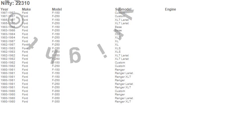 Below is an abbreviated list of applications for the Pro-Line Replacement Carpet.F-150, F-250, F-350, Ford, 1987, 1986, 1985, 1984, 1983, 1982, 1981, 1980