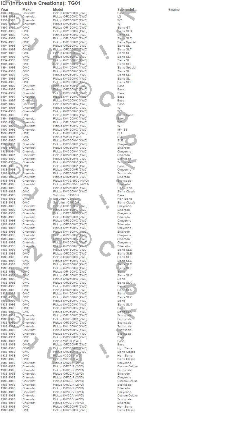 Below is an abbreviated list of applications for the Tailgate Protector.C1500 Pickup, C2500 Pickup, C3500 Pickup, K1500, K1500 Pickup, K2500 Pickup, K3500 Pickup, R20 Pickup, R2500 Pickup, R30 Pickup, R3500 Pickup, V30 Pickup, V3500 Pickup, Chevrolet, GMC, 1999, 1998, 1997, 1996, 1995