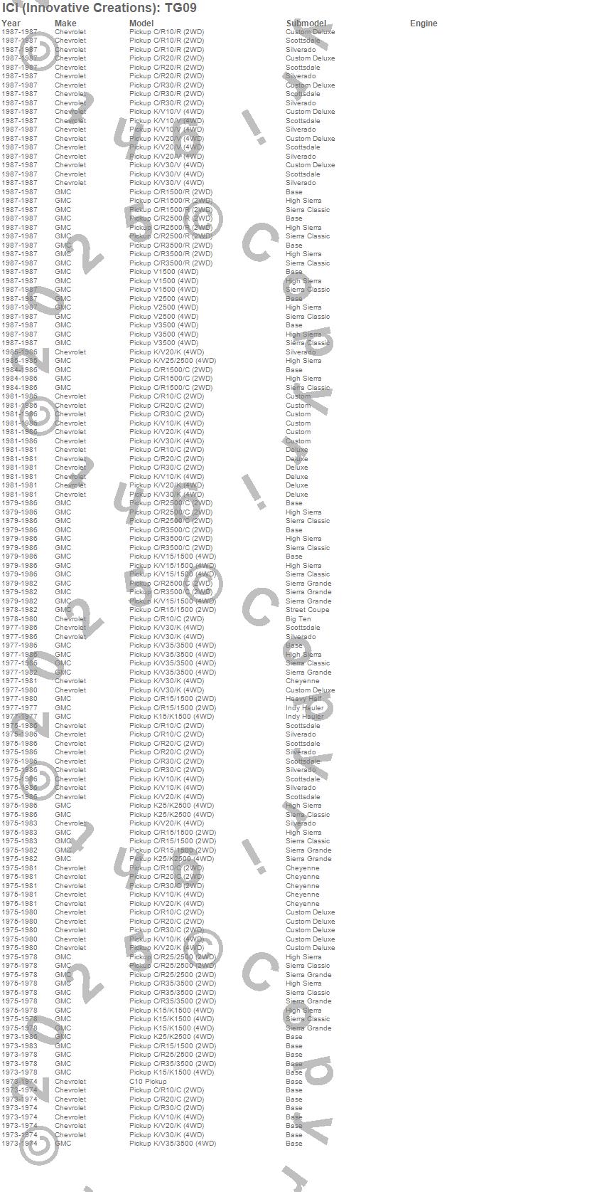 Below is an abbreviated list of applications for the Tailgate Protector.C10 Pickup, C1500 Pickup, C20 Pickup, C25/C2500 Pickup, C2500 Pickup, C30 Pickup, C35/C3500 Pickup, C3500 Pickup, K10 Pickup, K1500 Pickup, K20 Pickup, K25 Pickup, K25/K2500 Pickup, K2500 Pickup, K30 Pickup, K35 Pickup, K35/K3500 Pickup, K3500 Pickup, R10 Pickup, R1500 Pickup